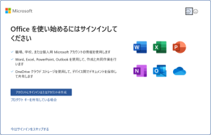 初めて起動した際は、アカウント認証画面とライセンス認証画面が表示されます - 「Officeを使い始めるにはサインインしてください」と表示されたら、「アカウントにサインインまたはアカウントを作成」をクリックします