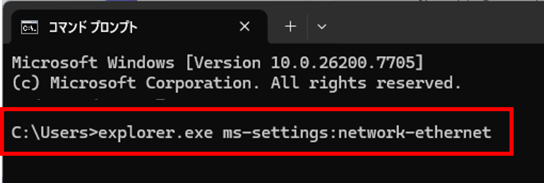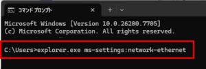 2.コマンドプロンプトに「 explorer.exe ms-settings:network-ethernet 」と入力して「Enter」キーを押します。